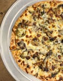 Our custom blend of Mozzerella, Smoked Provolone, Romano, Parmesan Cheeses. Pepperoni, Pork Sausage, Onions, Mushrooms, Green Peppers.