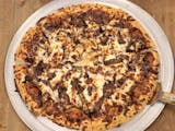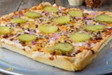 Our custom blend of Mozzerella, Smoked Provolone, Romano, Parmesan. Our Ketchup & Mustard sauce, and Beef. After cooking we top the Pizza with Colby/Jack cheese, Red Onions, and Hamburger Dills.