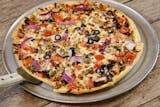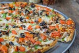 Our custom blend of Mozzerella, Smoked Provolone, Romano, Parmesan Cheeses. Onions, Mushrooms, Green Peppers, Black Olives, Roma Tomatoes, and Extra Cheese.